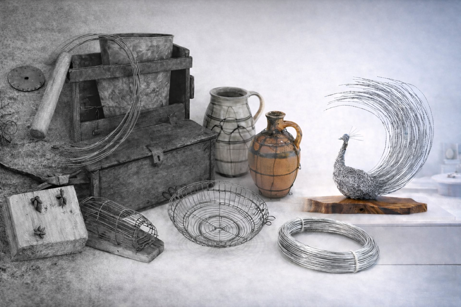 Všetky diela sú vytvorené ako jedinečný originál. Drôt je ručne ohýbaný a tvarovaný, pri tvorbe nie sú použité žiadne zvary ani lepenie. Diela sú vytvorené z pozinkovaného oceľového drôtu v kombinácii s prírodným orechovým drevom. Pozinkovaný oceľový drôt nie je po finalizácii diela nijako povchovo ošetrený, prirodzená reakcia materiálu nie je vadou, naopak, je žiaduca. Drevo je sušené na 8 – 9 % a povchovo upravené tvrdým voskovým olejom, menšie praskliny sú vytmelené živicou.